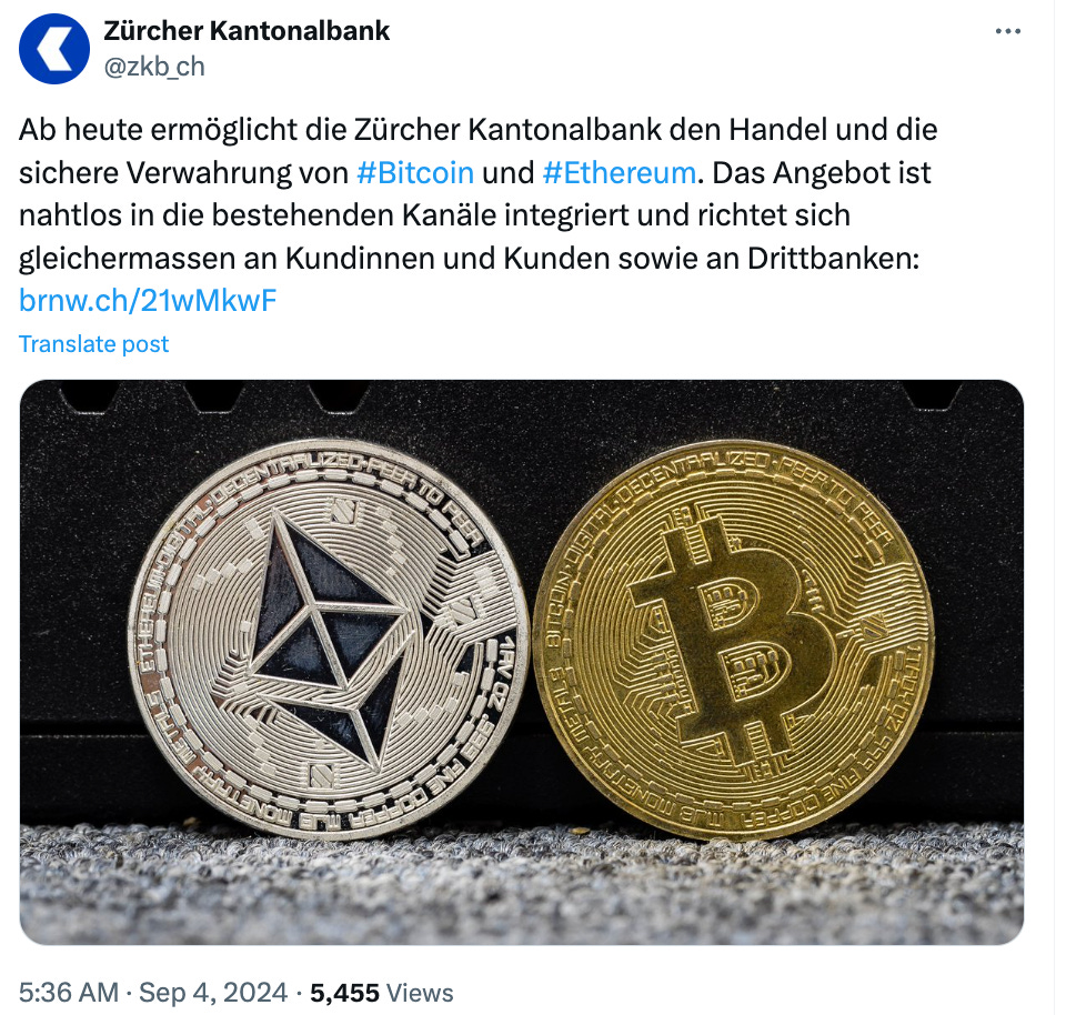 Zurich Cantonal Bank (ZKB), Switzerlandâs fourth-largest bank with an impressive $450 billion in assets under management, has unveiled a new service allowing customers to trade Bitcoin ($BTC) and Ethereum ($ETH) directly through its e-banking and mobile platforms. This initiative highlights ZKB's ongoing commitment to blending traditional banking with the burgeoning field of digital currencies.